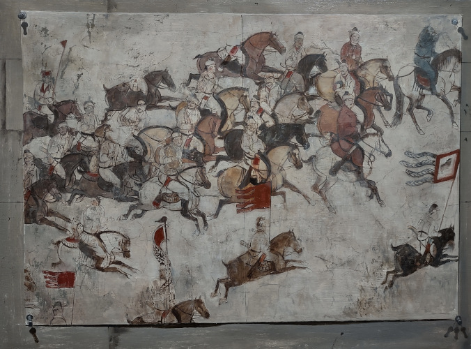 reproduction of chinese mural pinned to wall. oil/canvas 28x37